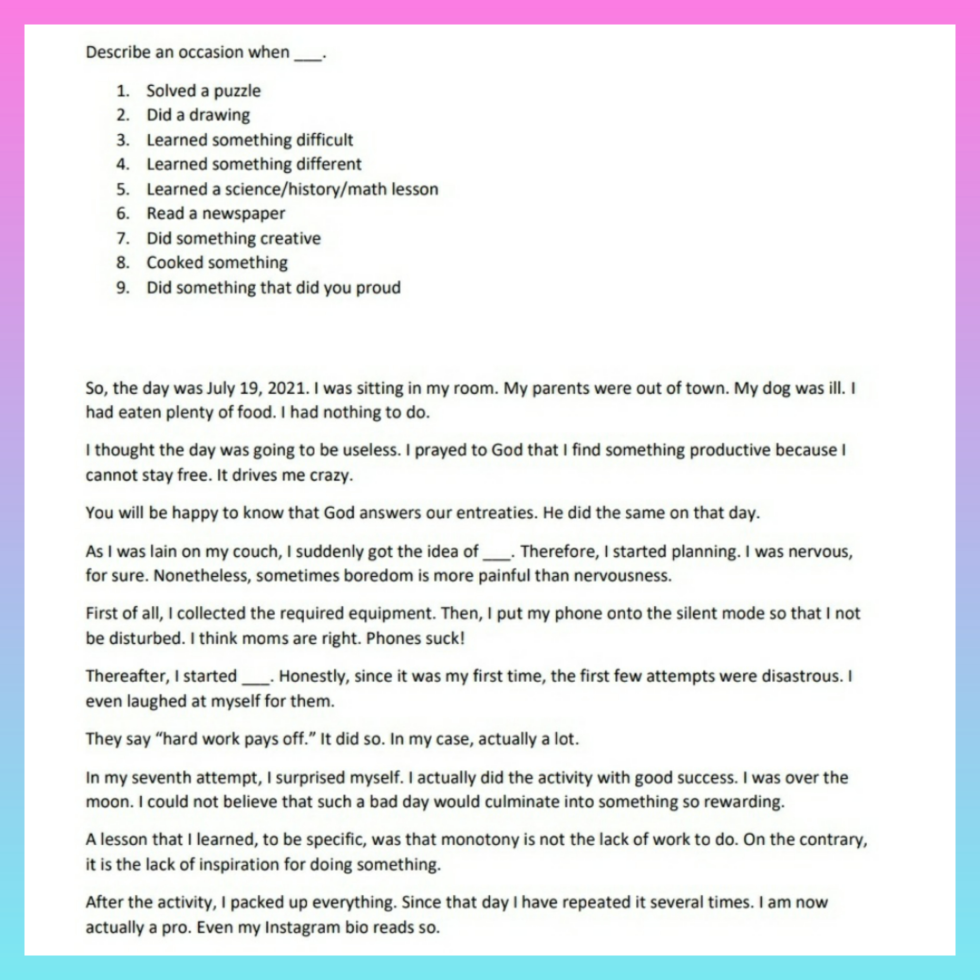 Cue Card, Speaking Cue Card Hack Band 7+ Date: August 22, 2021Author: Sudhir Chhabra 0 Comments Share this: Share on X (Opens in new window) X Share on Facebook (Opens in new window) Facebook Like Loading... Related