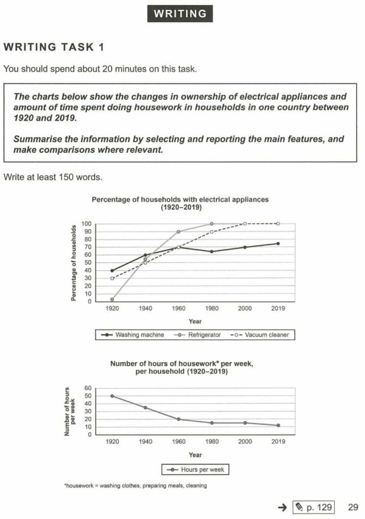The first line graph illustrates the proportions of families that possessed electronic appliances in a nation from 1920 to 2019. The second one represents how many hours a week were devoted to some household chores in a family in the same region during the same time period.