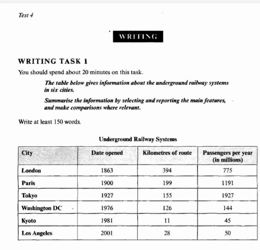 The given illustration is a tabular representation of some details regarding the belowground railway networks in six urban regions. These regions are London, Paris, Tokyo, Washington DC, Kyoto, and Los Angeles.