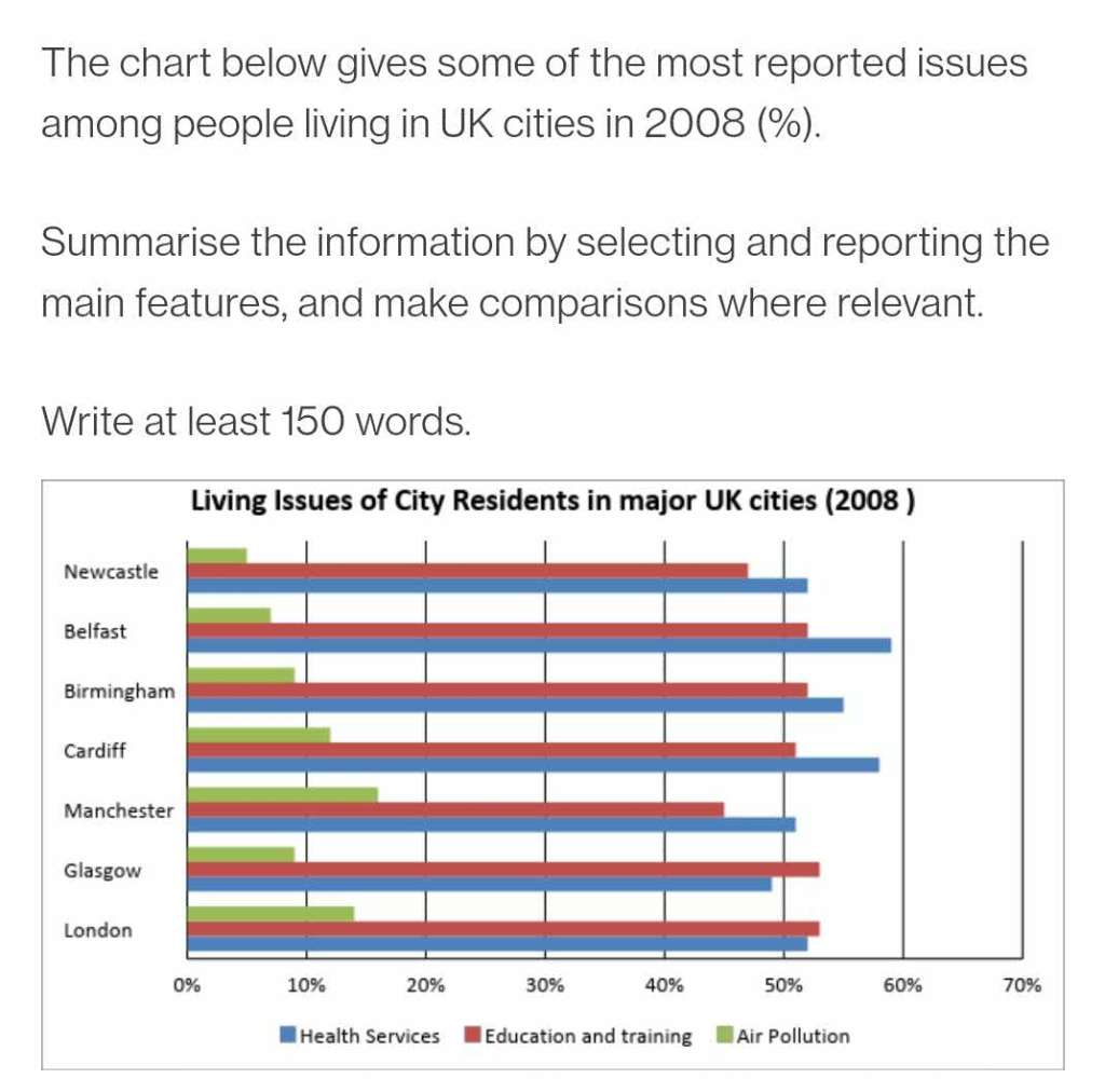 To begin with, in Newcastle, Belfast, Birmingham, Cardiff, and Manchester, between 50% and 60% of the citizens complained regarding health services. The proportions of those who said that education and training were improper were smaller in each of these five cities. Whereas the proportions of such individuals in Newcastle and Manchester were approximately 45%, those in the rest were a little more than 50%. Air pollution was an issue for nearly 5% to 16% of the individuals. It increases from Newcastle to Manchester by similar margins.