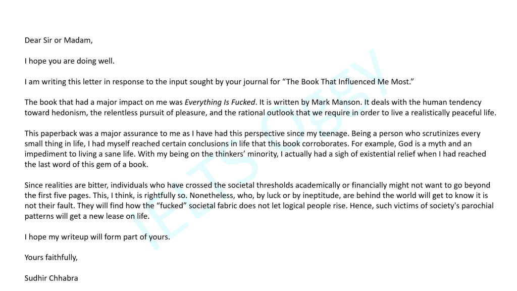 Writing Task 1 General Formal Letter to Editor Date: April 16, 2022Author: Sudhir Chhabra 0 Comments Share this: Click to share on X (Opens in new window) X Click to share on Facebook (Opens in new window) Facebook Like Loading... Related