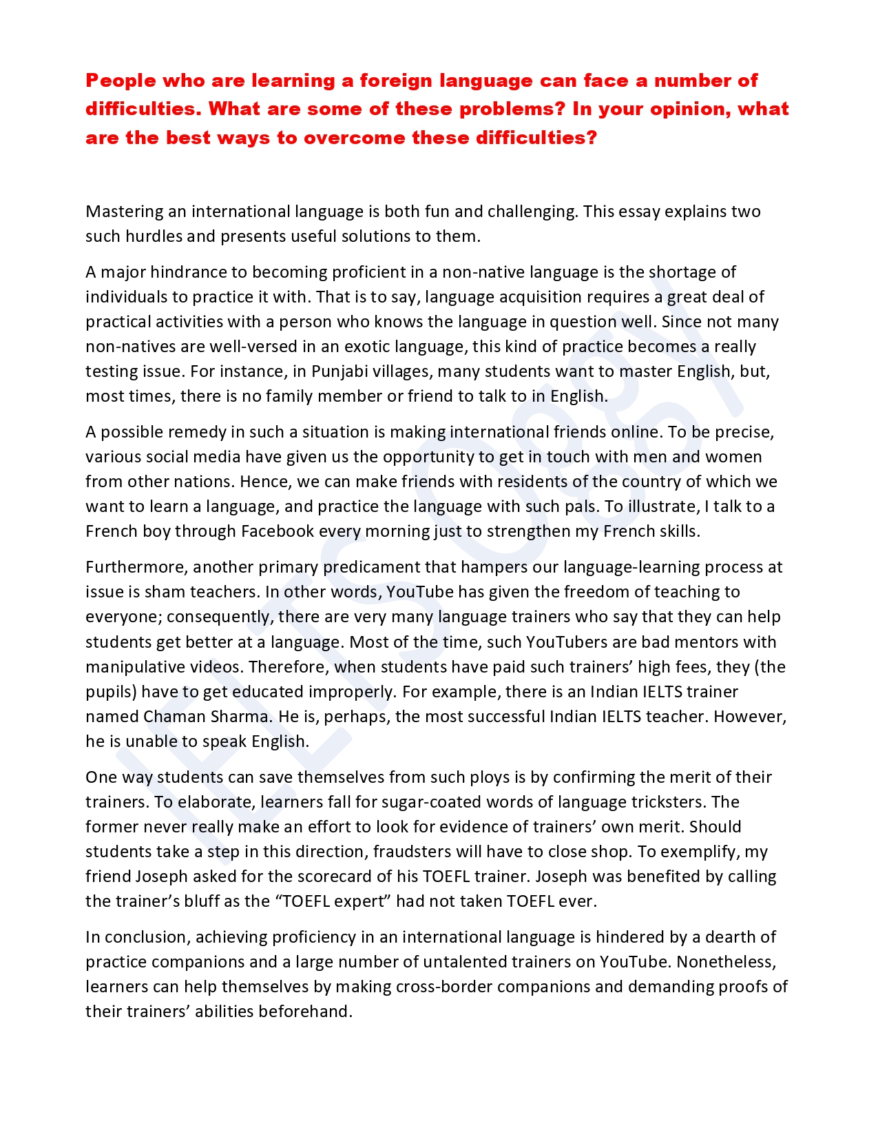 Writing Task 2 People who are learning a foreign language can face a number of difficulties. What are some of these problems? In your opinion, what are the best ways to overcome these difficulties? Date: September 27, 2022Author: Sudhir Chhabra 0 Comments Share this: Click to share on X (Opens in new window) X Click to share on Facebook (Opens in new window) Facebook Like Loading... Related